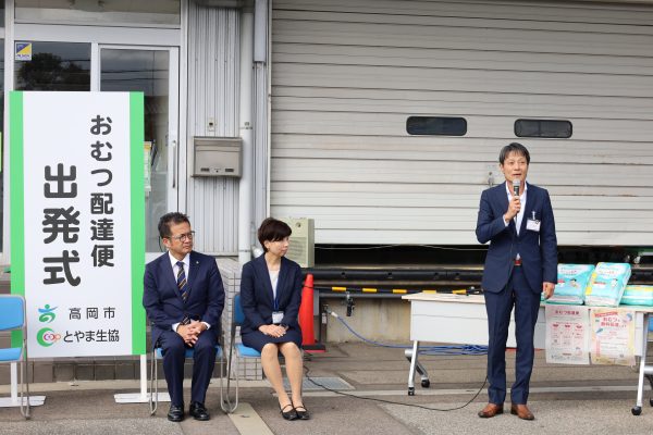 とやま生協 寺岡理事長の挨拶では、「高岡市との包括連携協定のもと、これまでにとやま生協の福祉施設の輝 城東で認知症カフェなど高齢者支援を進めてきました。今回の「おむつ配達便」は、そうした取り組みに続く子育て支援の新たな一歩であると位置づけ、地域に生まれてくる子どもは社会の宝として、おむつの配達を通じて支援ができると考えています。高岡市の約1万9,600名の組合員の皆さんとともに、住み慣れた地域で安心して暮らし続けられるまちづくりに貢献していきたい」と述べました。