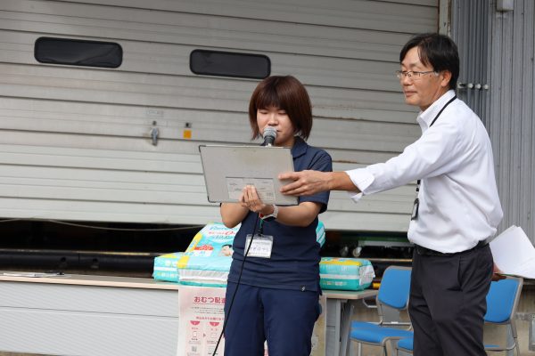 配送スタッフの杉林あみさんは、「一児の母としての経験を生かし、おむつを届けるだけでなく、子育て中の悩みや不安にも寄り添える存在になりたい」と決意を述べ、列席者に見送られながらおむつのお届けに出発しました。