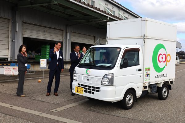 10月15日(水)、高岡市ととやま生協によるひとり親家庭への「おむつ配達便」の出発式を西部センターで行いました。