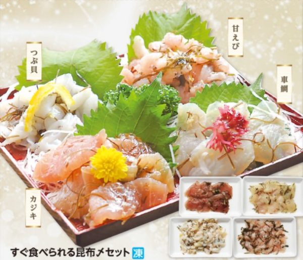 高岡市の葵食品が製造している、富山名物「昆布〆」の人気商品セットです。かじき、車鯛、甘えび、つぶ貝の4種類が入った、お酒の肴にももってこいの一品。県外からのお客さんへのおもてなしにもおすすめです。