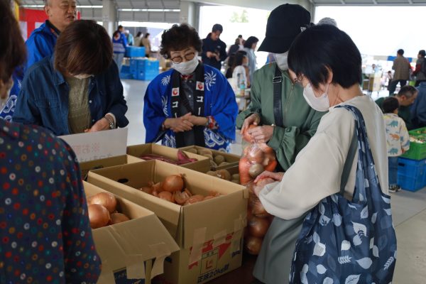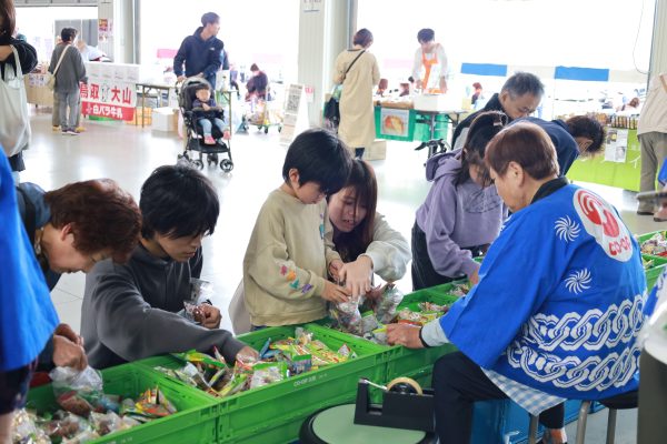 今年の目玉「野菜・お菓子の詰め放題」コーナーは、早速たくさんの方で大盛況に!