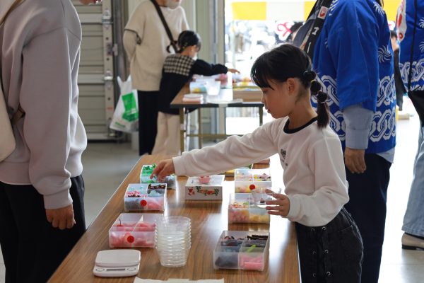 制限時間内にどれだけ多くの野菜やお菓子を詰め込めるか、大人も子どもも真剣な表情で挑戦しておられました。スタッフから「残り5秒!」などの声掛けがあると、みなさん「やばいやばい」「もっと入れよう!」と慌てた様子でラストスパート!