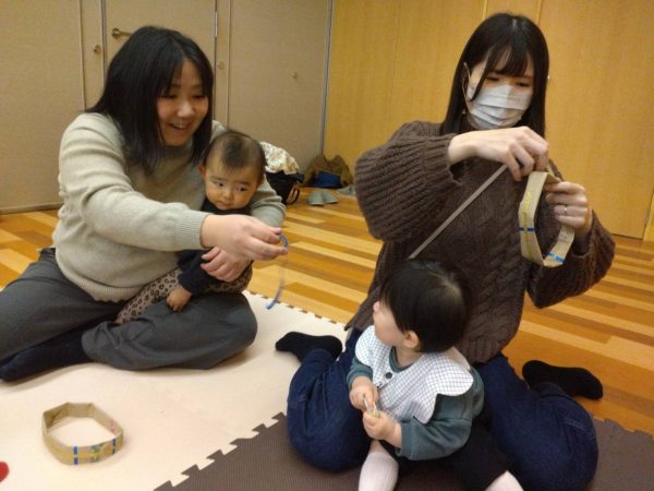紙を丸めて輪っかを作り、テープで飾り付けをして、世界に一つだけのハンドルが完成♪ハンドルを握って、ママのお膝に乗って、音楽に合わせて左右にゆらゆら揺られてドライブ気分を楽しみました♪