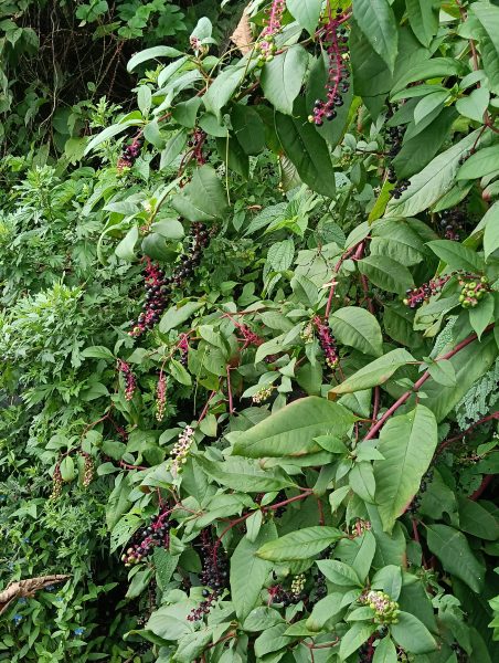 その後、目的地の毘沙門天堂に向かって、富山湾や高岡の街並みを望みながら散策しました。道中、二上山に自生している植物について「この大きな木の葉っぱは朴葉焼きに使われますよ。」「ミズヒキソウは葉の表は赤く裏を返すと白く水引に似ているのが名前の由来です。」「紫の実のなる外来種ヨウシュヤマゴボウは見た目食べられそうですけど毒があるので要注意です。」など教えていただきました。