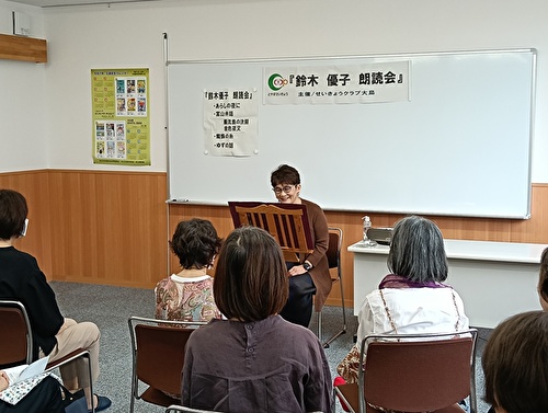 せいきょうクラブ大島では朗読家の鈴木優子さんを招いて「朗読会」をおこない、18名の方が参加しました。