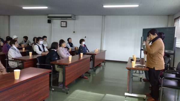 交流会では農家の大沢さん、持田さん、事務の尾島さんより、信州産直組合の概要やりんご作りについて、おすすめのりんごジュースの試飲をしながら伺いました。「農薬は最小限にし、見かけ重視ではない安全でおいしいりんごを消費者の方に食べてもらいたいという思いで生産しています。農家からのお願いですが、りんごの皮と実の間が一番おいしいところなので是非水洗いして皮ごと食べて欲しいです」と話がありました。