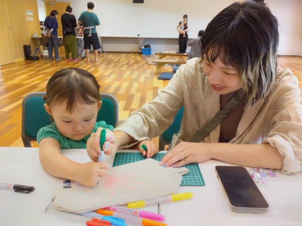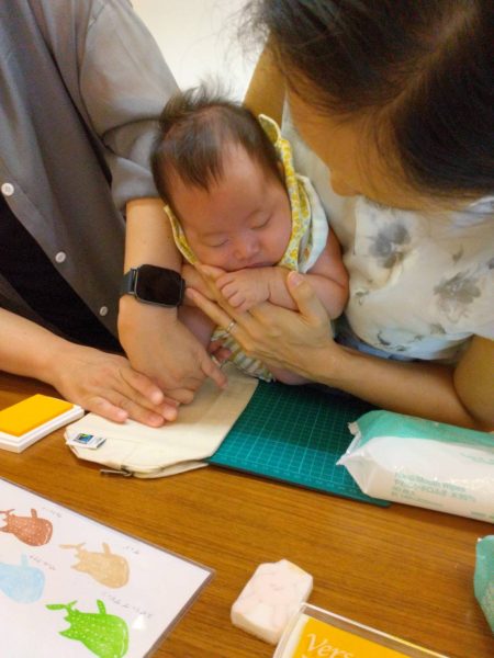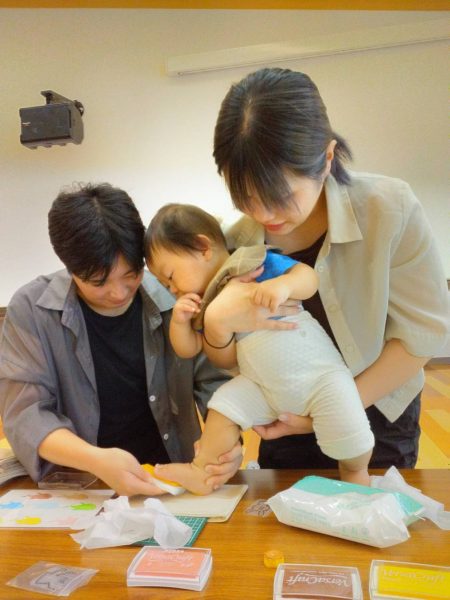 泣き出してしまうお子さんや初めての体験に驚いた様子のお子さんがおられましたが、ご家族の方はそんなお子さんの様子を笑顔で見守っておられました。スタンプをした後は、手や足をくまさんやウサギさん、クジラなど動物の形に見立てて、ペンで顔を書いたり、お花などを周りに描いたり、お子さんの名前を書いて作品を仕上げます。