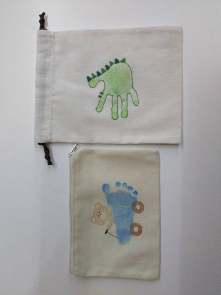 手形・足形アートは、お子さんの手や足の裏にインクでポンポンと色付けをして、ご家族の方に抱っこをしてもらいながら、トートバッグやポーチなどに手や足を押し付けてスタンプを押します。