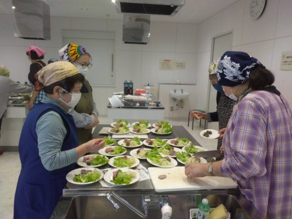調理では、ローストポークとこんにゃく巻ごぼうをカットしてお皿に盛り付けをするグループ、そばを作るグループ、牛乳かんてんを作るグループの3つのグループに分かれました。みなさんそれぞれのグループで、調理を通して楽しそうに交流しておられました。