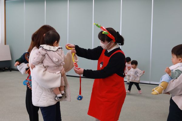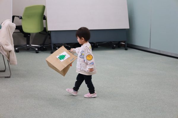 さて、今回はクリスマス会ということで……、なんと会場にサンタさんが登場!いい子に過ごしていたお友達のみんなに、一人ずつプレゼントを渡してくれました😊