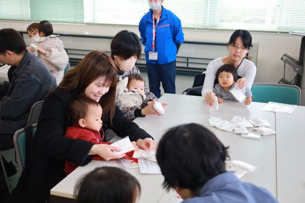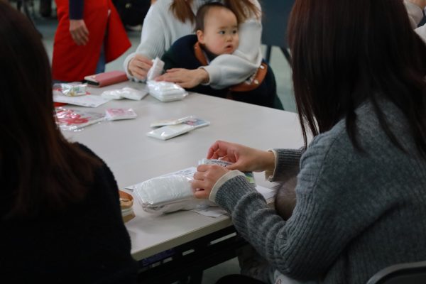 お子さんとお出かけのときにも使える消耗品とあって、みなさん真剣な表情。ティッシュを詰める前に袋を引っ張って伸ばしたり、ティッシュを小さくたたんで詰め込んだり、様々な工夫をしながらたくさんのティッシュを詰め込んでいました。