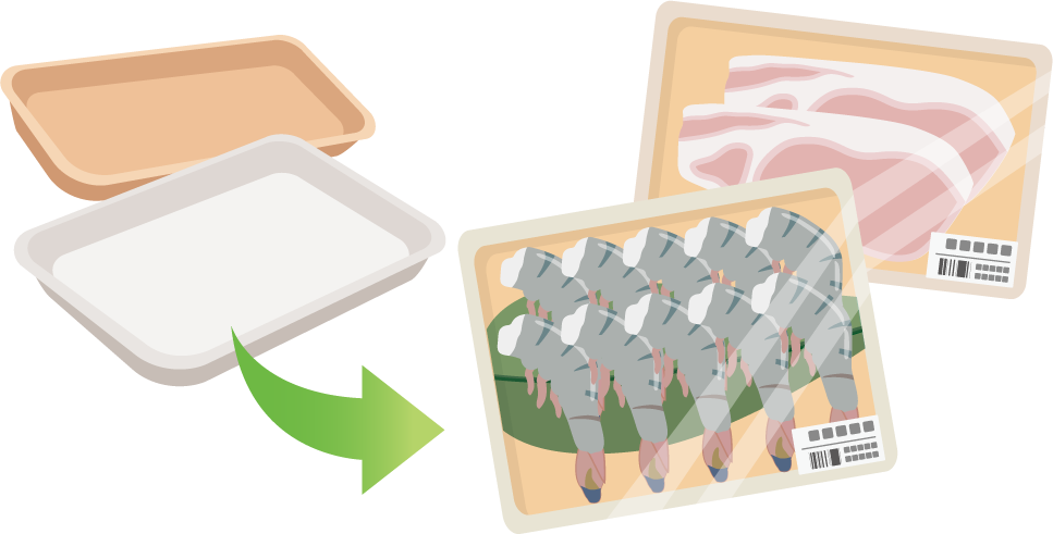 お店で使用するトレーは、再生プラスチックを使用。石油由来のプラスチック使用量を削減します。
